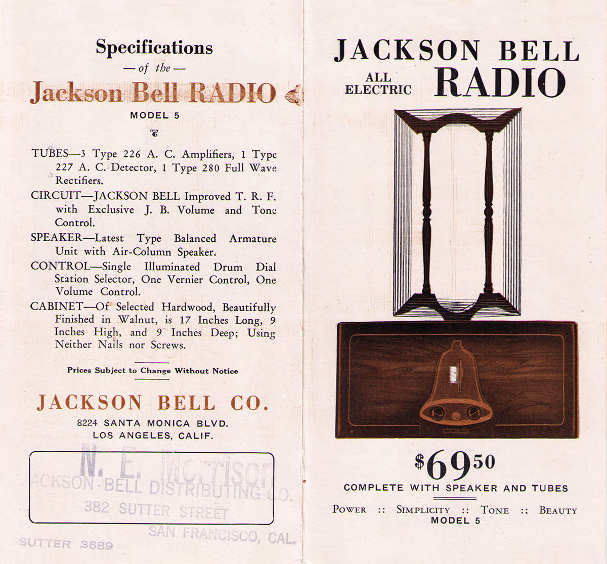 This is the second known radio produced by Jackson-Bell. It has a large heavy bell on the front. The built-in speaker was uncommon for the day. Two versions with different tube compliments exist.